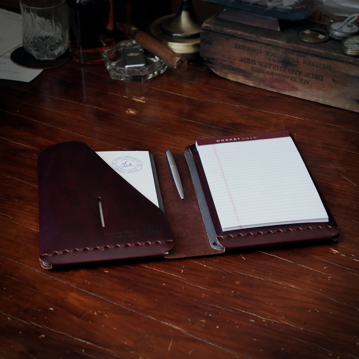 Each of our Murdy No. 3 folios will come with a pre-installed writing pad as well as a stainless steel and gold trim Parker Jotter. Hardcover backed in 8-9 oz U.S. Steer leather, the writing pad has a firm feel in hand.Â
