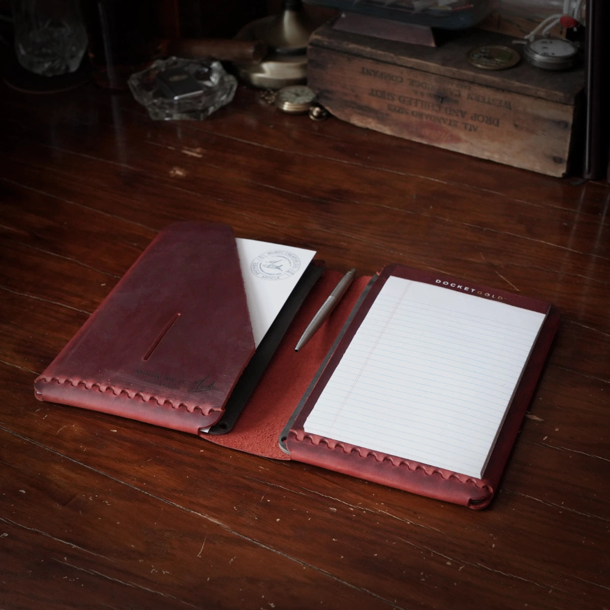 Made in the USA using red full grain leather, this limited edition offering features light pull-up contrasts, and a light suede backing, and is pre-installed with a Mini Legal Pad.