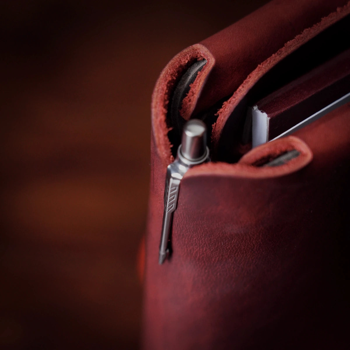 Each of our Murdy No. 3 folios will come with a pre-installed writing pad as well as a stainless steel and gold trim Parker Jotter. Hardcover backed in 8-9 oz U.S. Steer leather, the writing pad has a firm feel in hand.