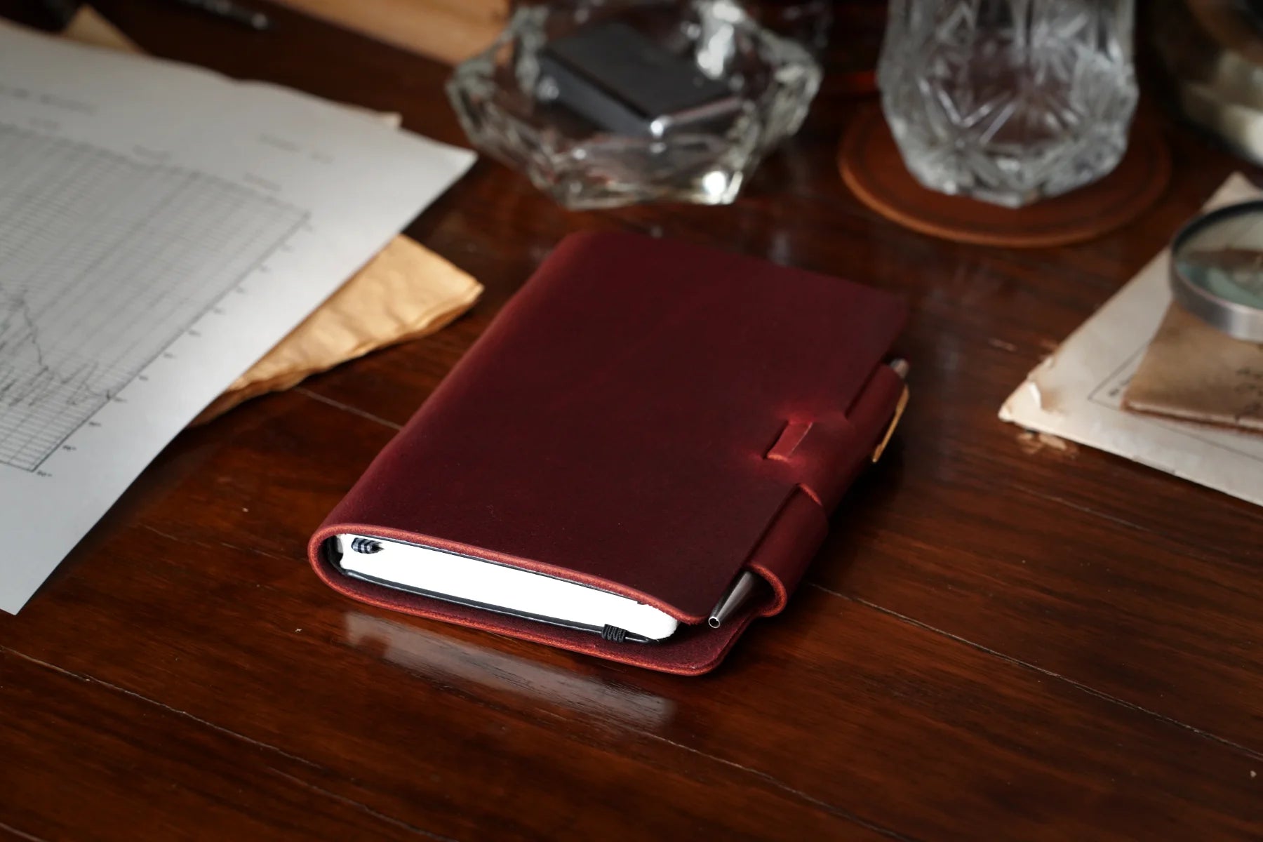 Our Limited Edition red leather Mini Cut journal, available in limited quantities. Handcrafted with 5-7oz full-grain cowhide, our Limited Edition red leather is chrome and oil-tanned in Milwaukee, Wisconsin. This waterproof leather resists water absorption, causing liquids to bead and roll off effortlessly.