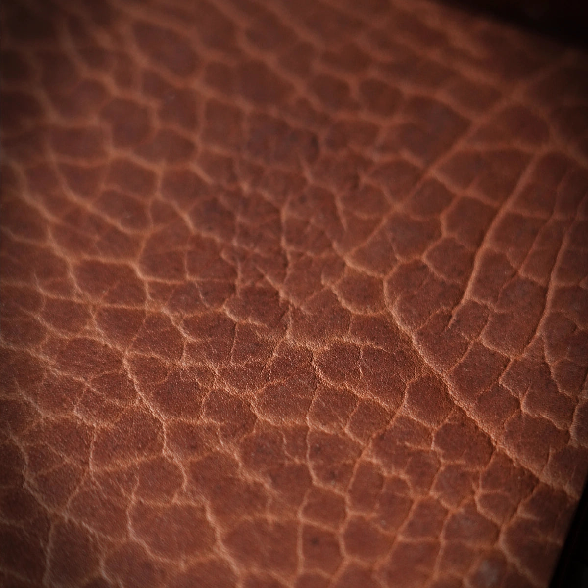 Our Limited Edition Burnt Orange Bison leather, available in limited quantities. Tanned and embossed in the USA, this chrome-tanned Bison is pebbled with a beautiful 3d grain pattern that creates rich highlights and resists damage.